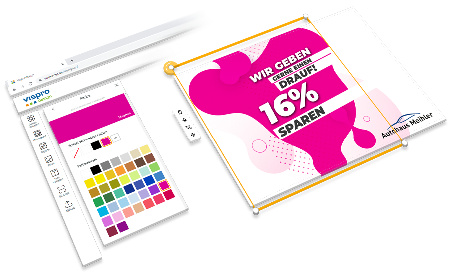 Selbst gestalten ohne eigenes Grafikprogramm – ganz einfach mit unserem Online-Tool Visprodesign®. Nutze unzählige kostenlose Grafikvorlagen, Cliparts und Schriften und kombiniere sie mit deinen persönlichen Fotos. Wähle dafür in der Konfiguration die Option „Selbst gestalten“.