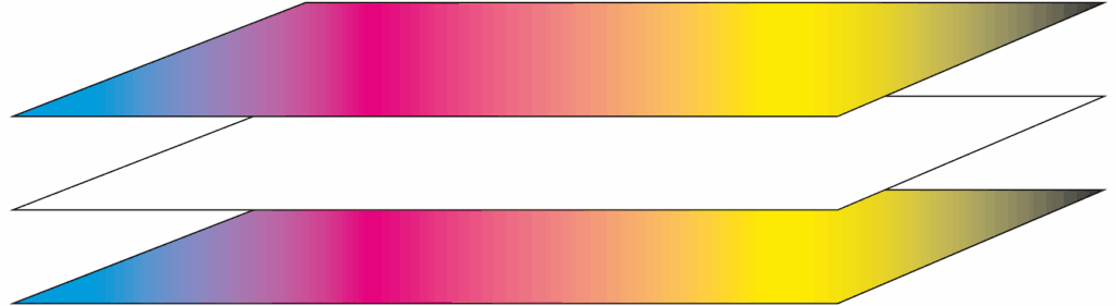 Das Motiv wird zweifach auf das Material aufgebracht und im selben Druckprozess mit einer zusätzlichen weißen Farbschicht zwischen diesen ergänzt.