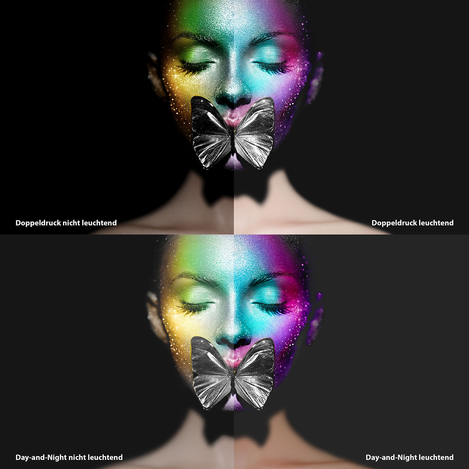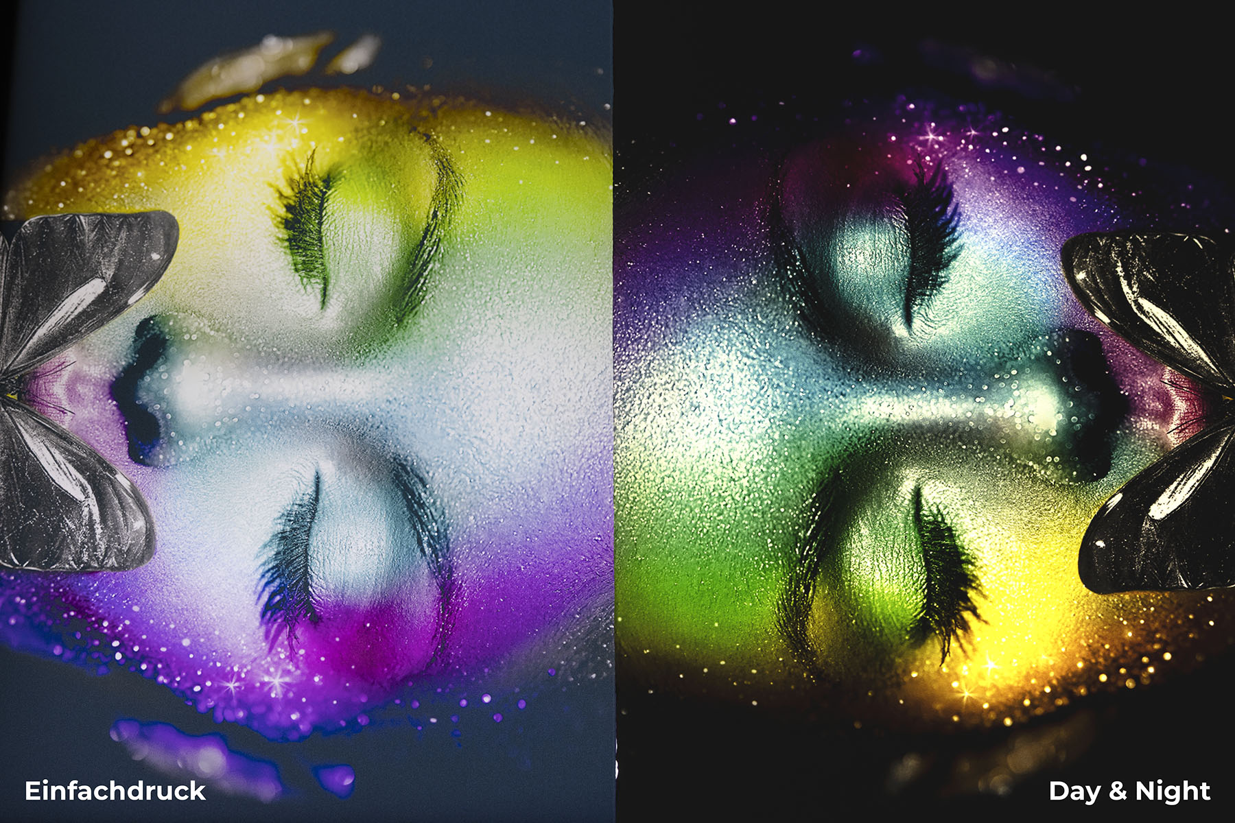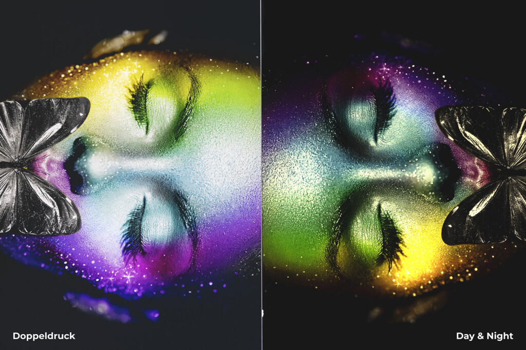 Vergleicht man jedoch die beiden Druckvarianten direkt miteinander, fällt schnell auf: Der Doppeldruck lässt die Gestaltung bei ausgeschaltetem Licht sehr dunkel und Farben weniger brillant erscheinen.
