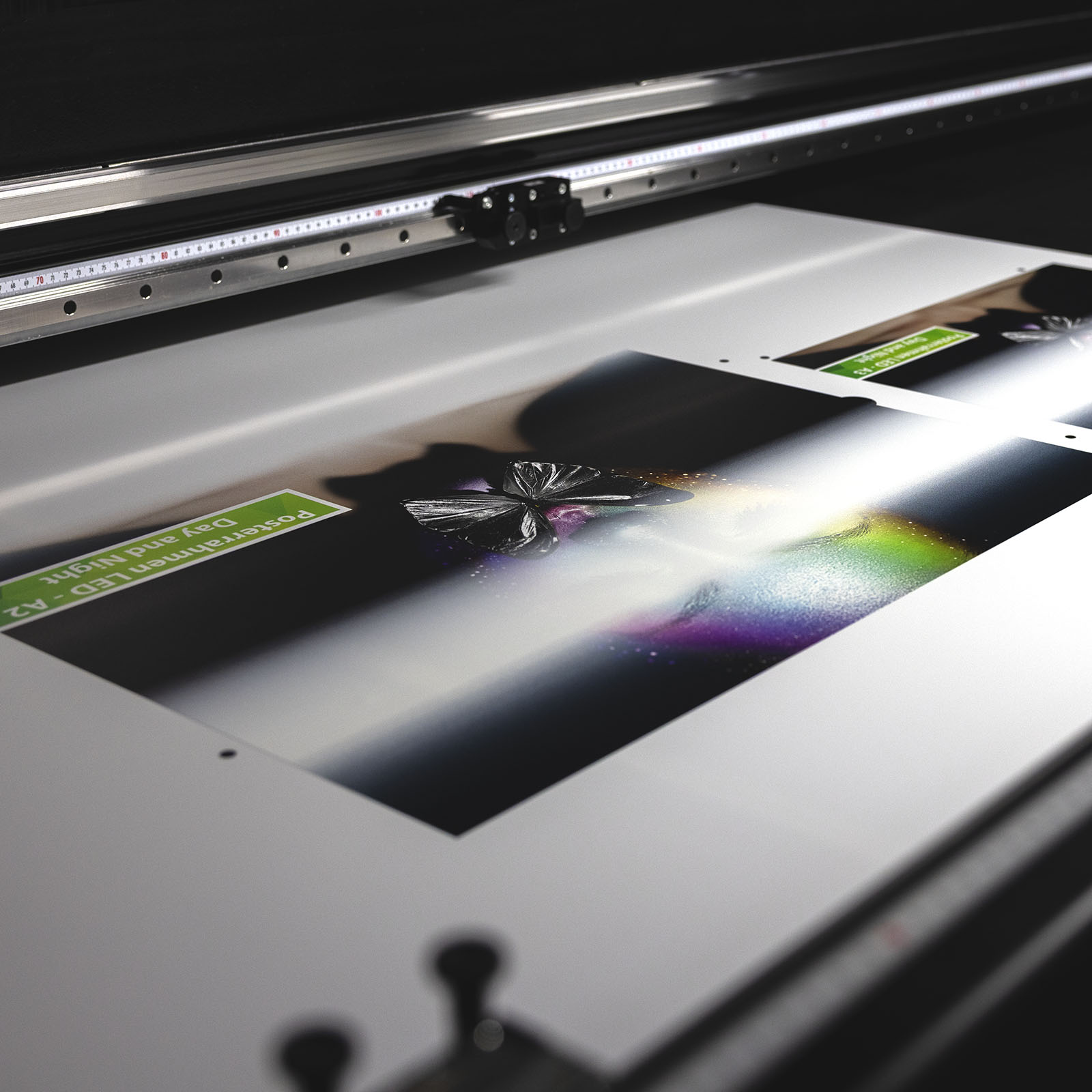 Dank unserer modernen Plattenmaschine P5 350 HS haben wir die Möglichkeit, die sogenannte „Day & Night“ Drucktechnologie für LED-Produkte wie beispielsweise unsere Posterrahmen anzubieten.