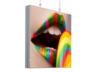 Dieser dreidimensionale Deckenhänger lässt sich auf allen Seiten individuell gestalten und bietet damit riesige Werbeflächen für Messen, POS oder Showroom.