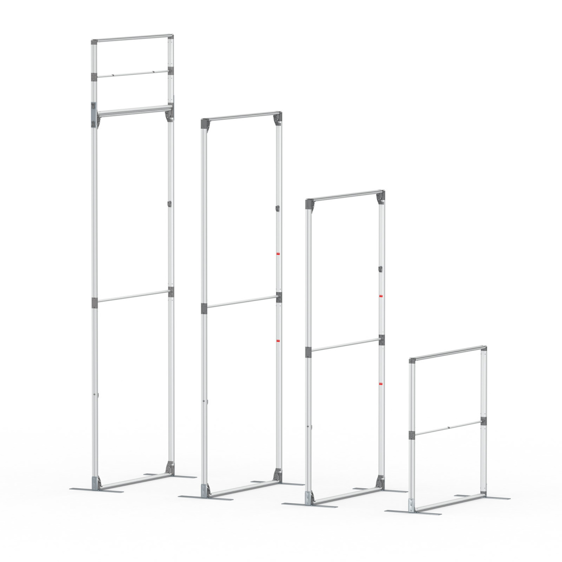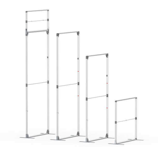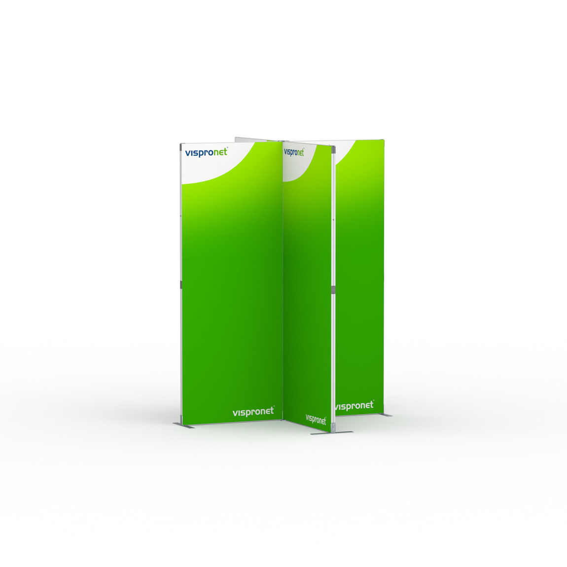 X-Modul als markanter Blickfang: 4 kreuzfrörmig montierte Kederrahmen erzeugen eine auffällige Struktur Ihres Messestandes und sorgen mit brillanten Textildrucken für maximale Präsenz auf kleiner Fläche.
