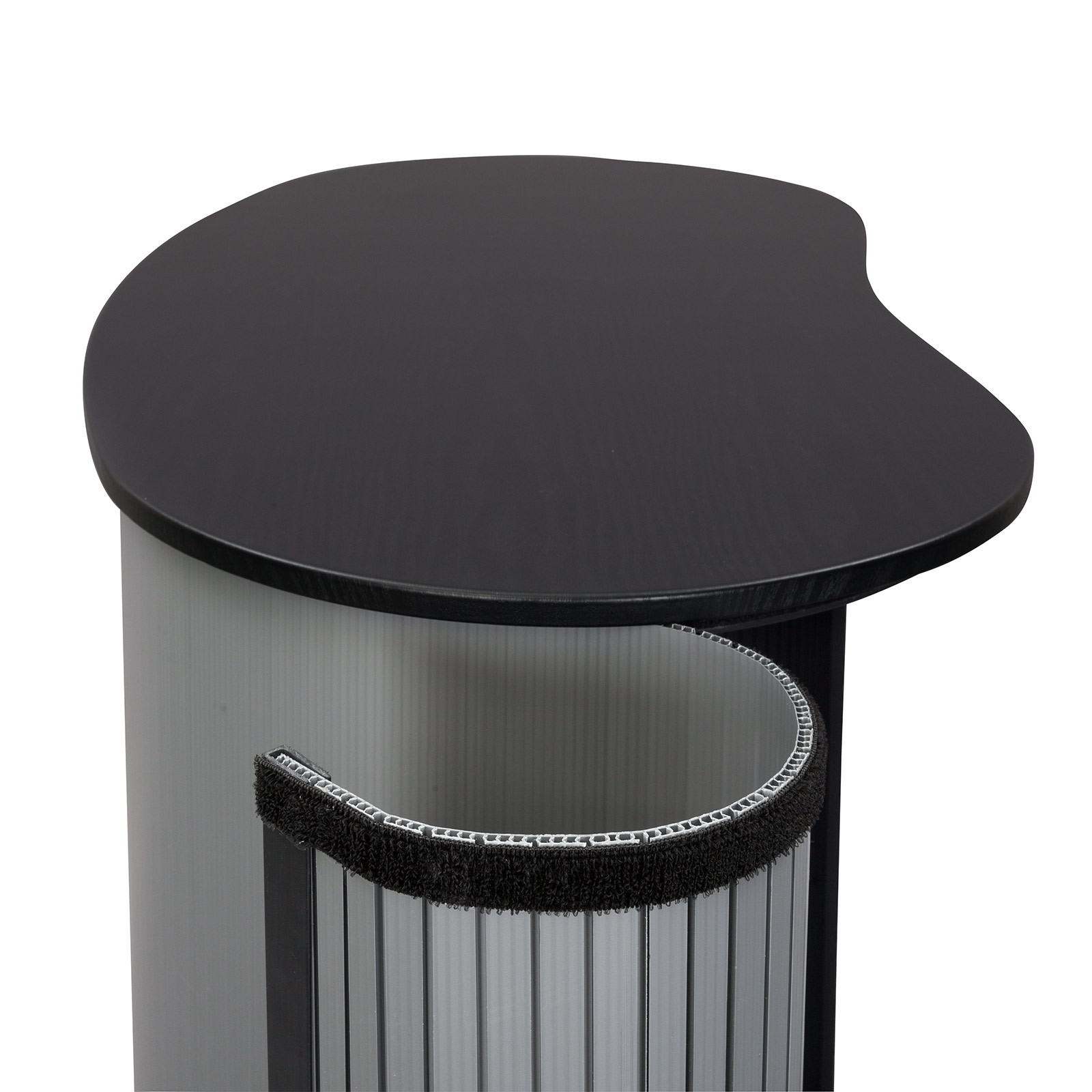 - Komplett-Set: Messetheke Lamellen Counter (gebogen oder rund) mit Lamellenpanel, Theken- und Bodenplatte sowie ggf. Ablagezwischenboden und Druckteil inkl. Transportköcher und Transporttasche